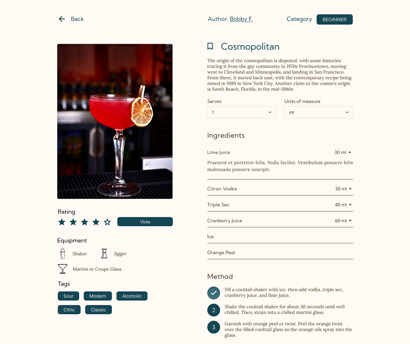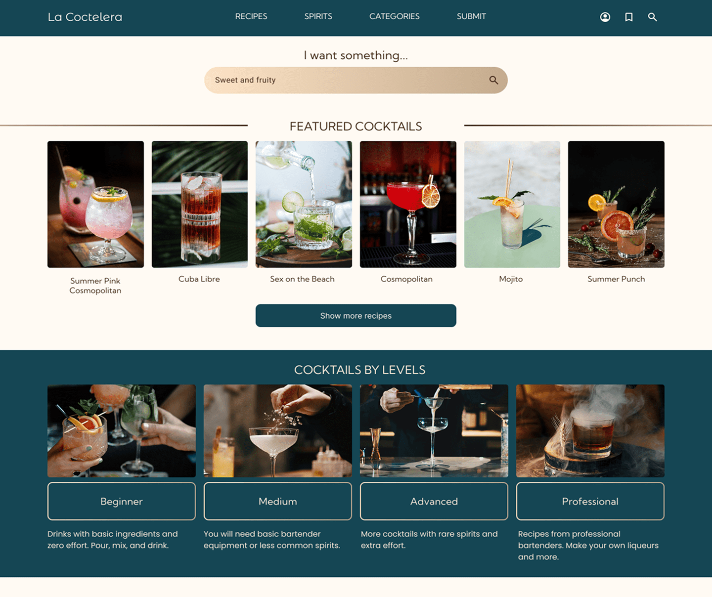 La Coctelera is a responsive web platform designed for cocktail enthusiasts of all levels, from a beginner to a professional mixologist. It allows users to discover, share, and create cocktail recipes. The platform emphasizes community, easy navigation, and a visually appealing presentation of recipes.