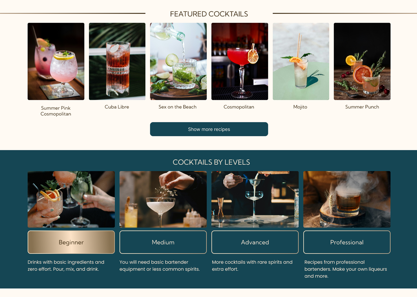 - Simple category navigation from beginners to professional bartenders. The home screen features easily navigable categories, allowing users to browse and discover cocktail recipes according to their level with minimal effort.
