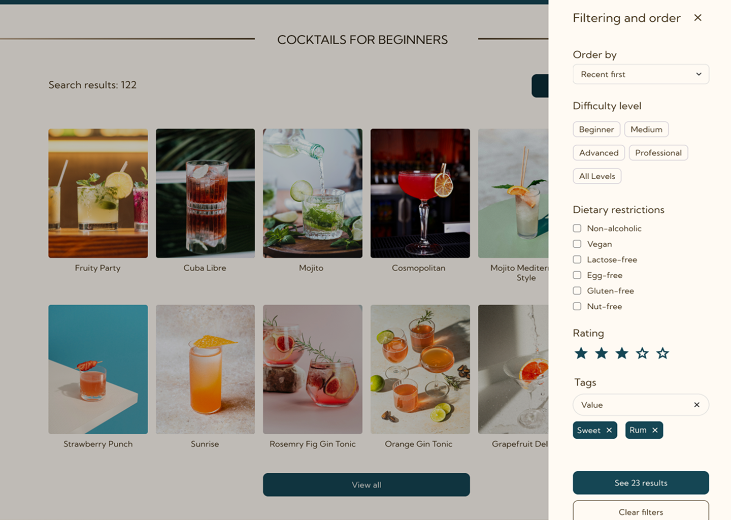- Users find filter options limited and expressed their desire to have filter options for non-alcoholic recipes and other dietary restrictions.