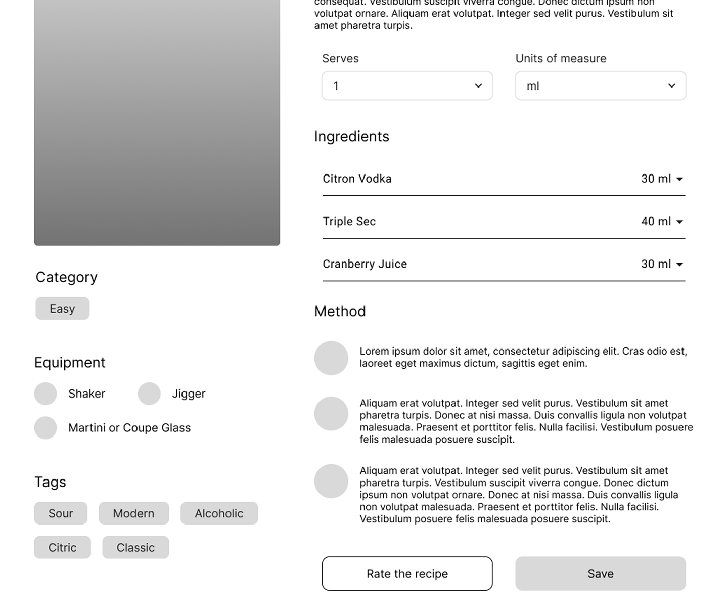 To simplify recipe saving, I replaced the ‘Save’ button with a bookmark icon at the top of the page, next to the cocktail name, eliminating the need to scroll.