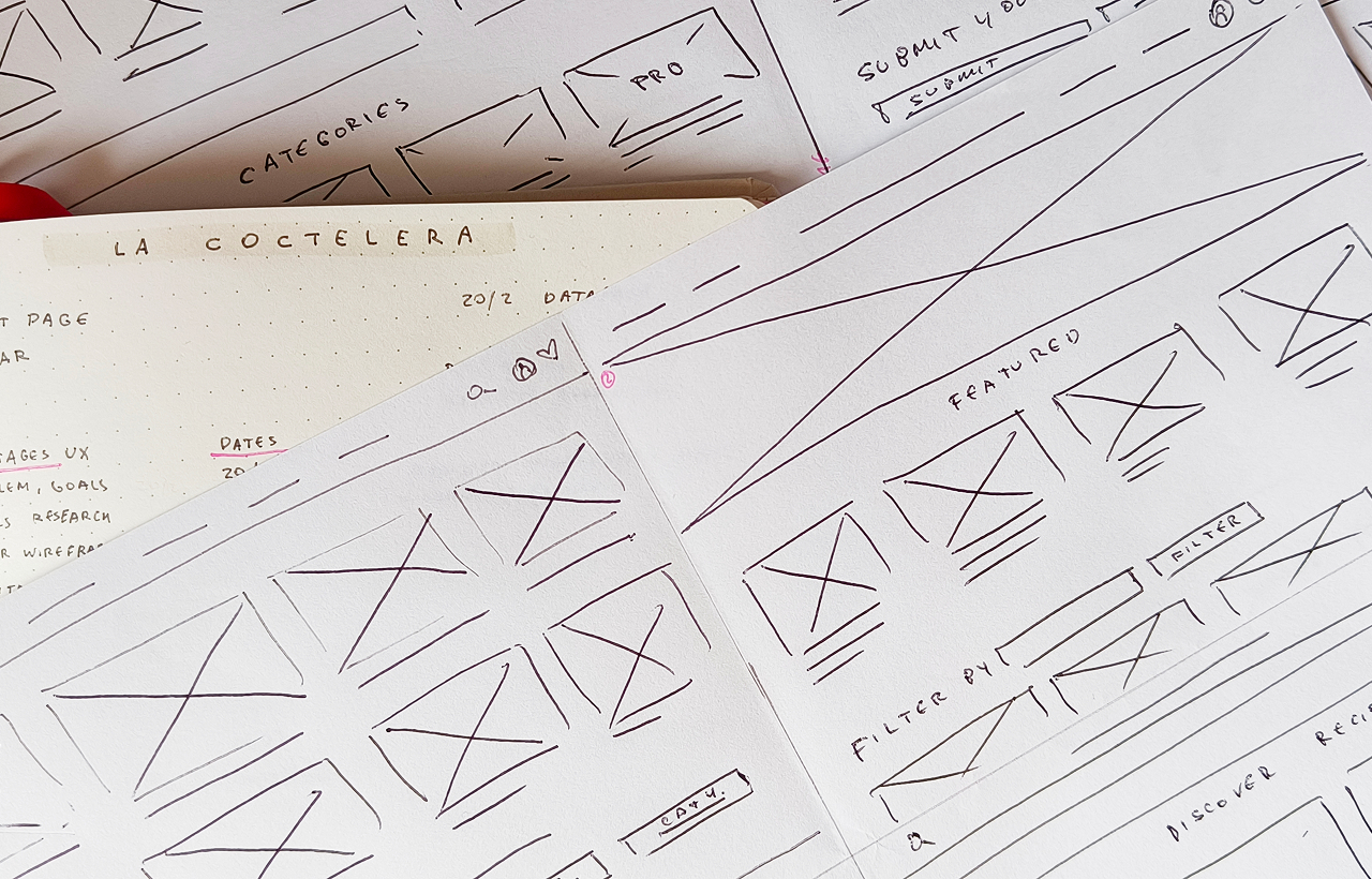 La Coctelera Homepage v1.0. Red dots were used to mark the elements of each sketch that would be used in the initial digital wireframes.